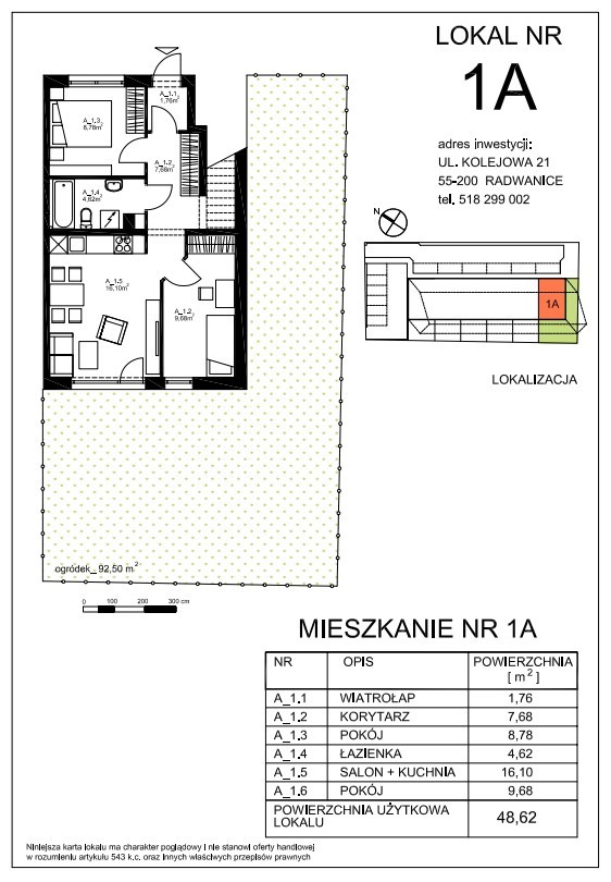 | 1A | 48,62 m² | Ogród 92,50 | Karta lokalu | Rezerwacja |