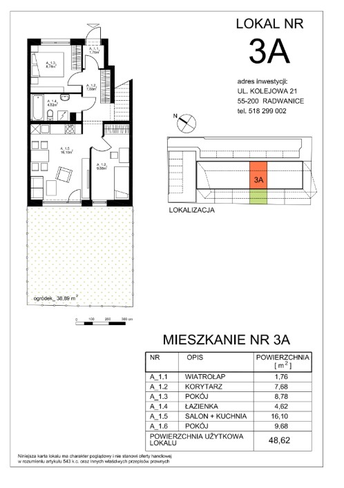 | 3A | 48,62 m² | Ogród 38,89 | Karta lokalu | Dostępny | 549 000 zł | 11 291,65 zł/m² |