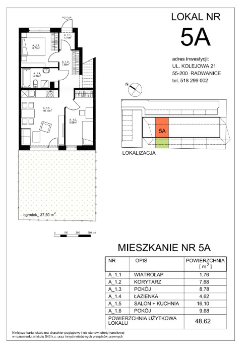 | 5A | 48,62 m² | Ogród 37,50 | Karta lokalu | Dostępny | 542 000 zł | 11 147,68 zł/m² |