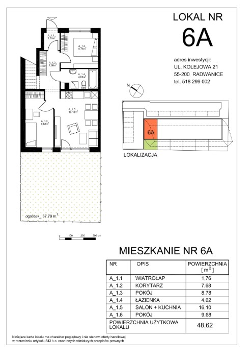 | 6A | 48,62 m² | Ogród 37,79 | Karta lokalu | Dostępny | 542 000 zł | 11 147,68 zł/m² |