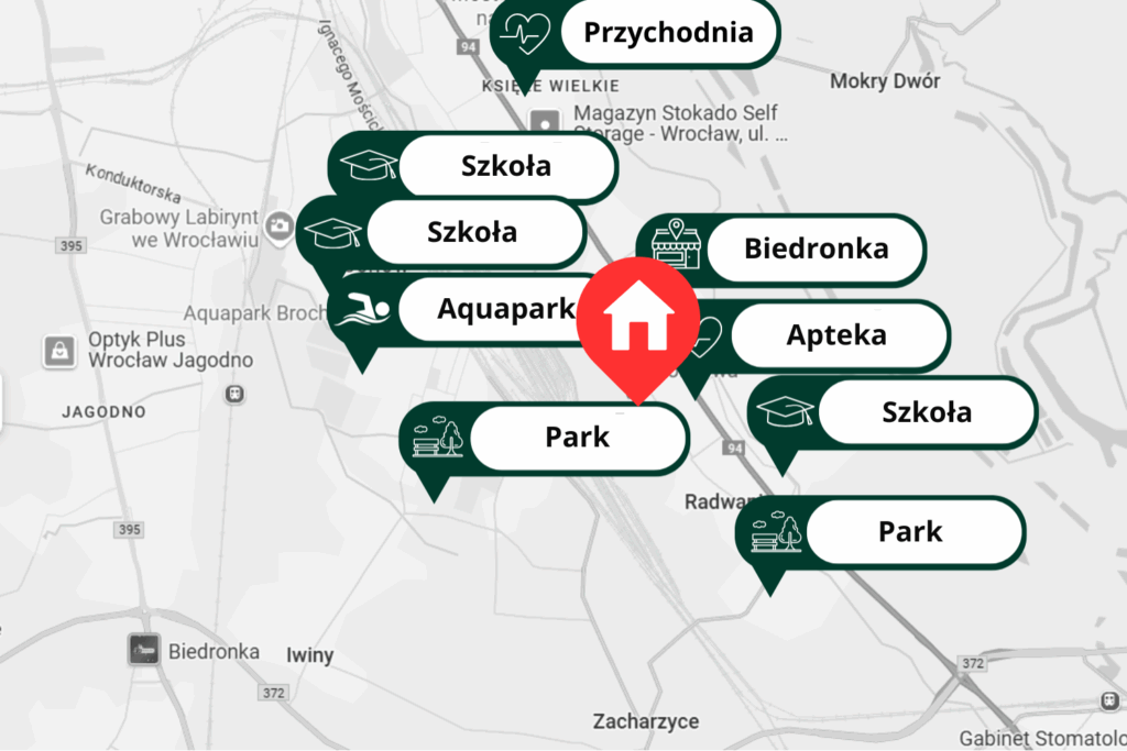 - Wrocławski Rynek - ok. 13 min autem (8km) - możliwość dojazdu do Wrocławia tramwajem (omijając korki) z pętli tramwajowej Książę Małe